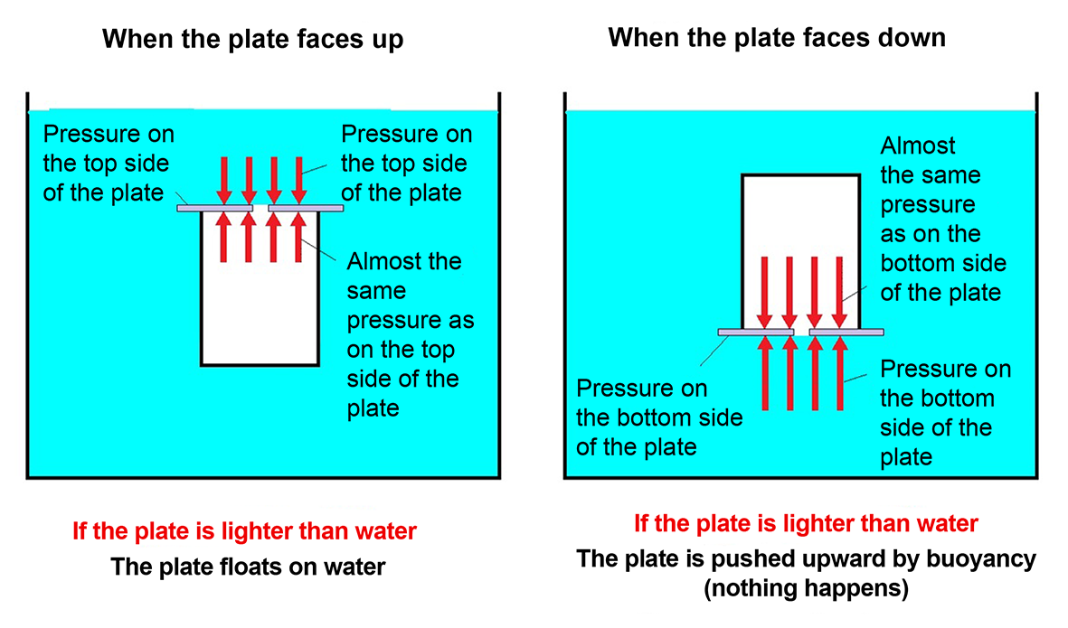 - In this case, the plate remained pressed against the container because it was lighter than water.