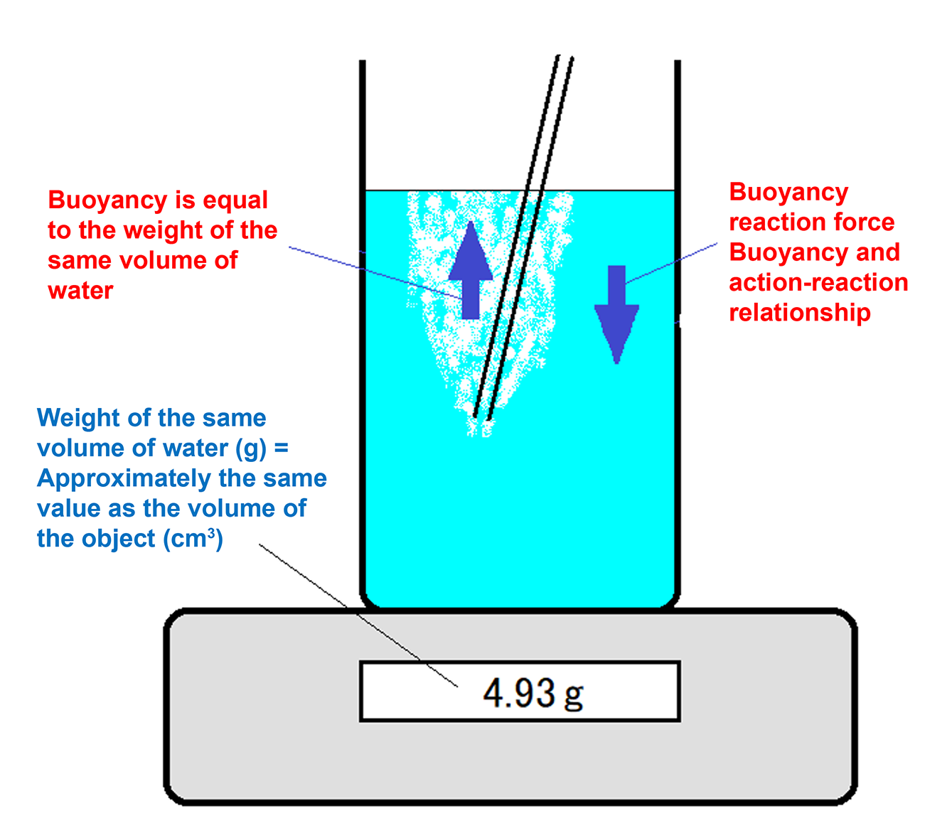 - To be precise, the water’s resistance slightly reduces the measurement, but this effect is minimal compared to buoyant force, so the scale reading provides a close approximation of the bubble volume.