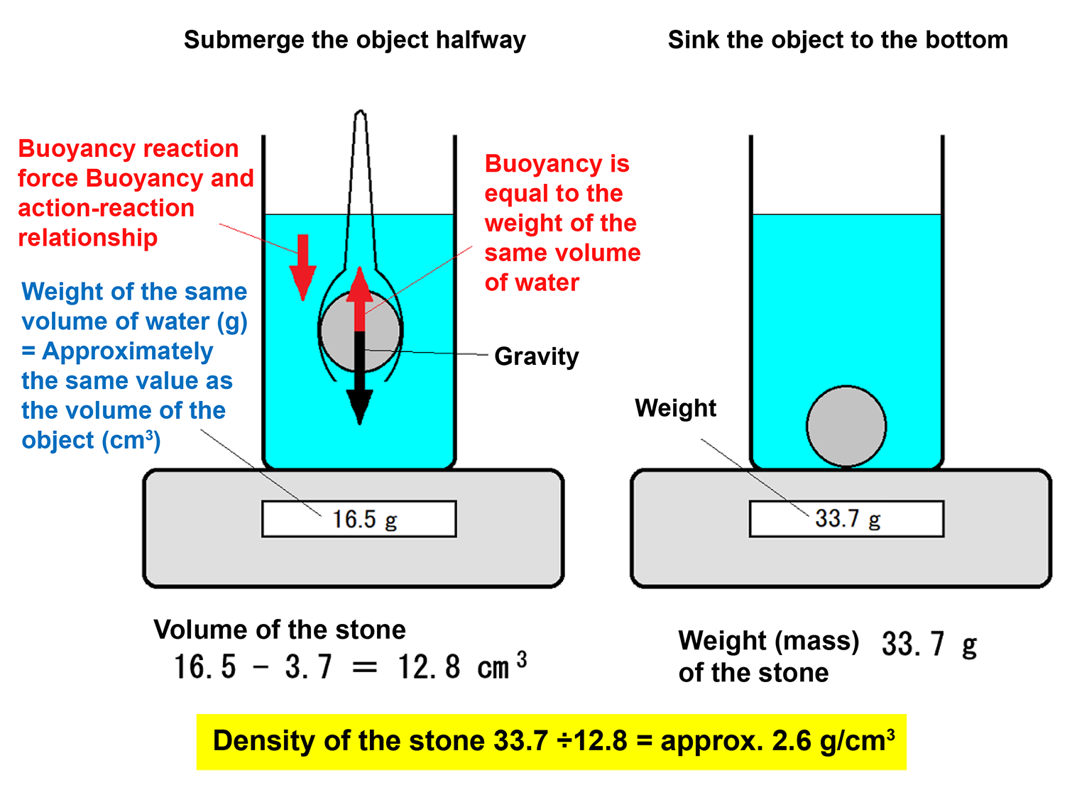(Density) = (mass) ÷ (volume) = 33.7 (g) ÷ 12.8 (cm3) = approximately 2.6 (g/cm3). - Since the density of water is approximately 1.0 g/cm3, any object with a density greater than this will sink. Therefore, the stone “is heavier than water” means it has a higher density than water.