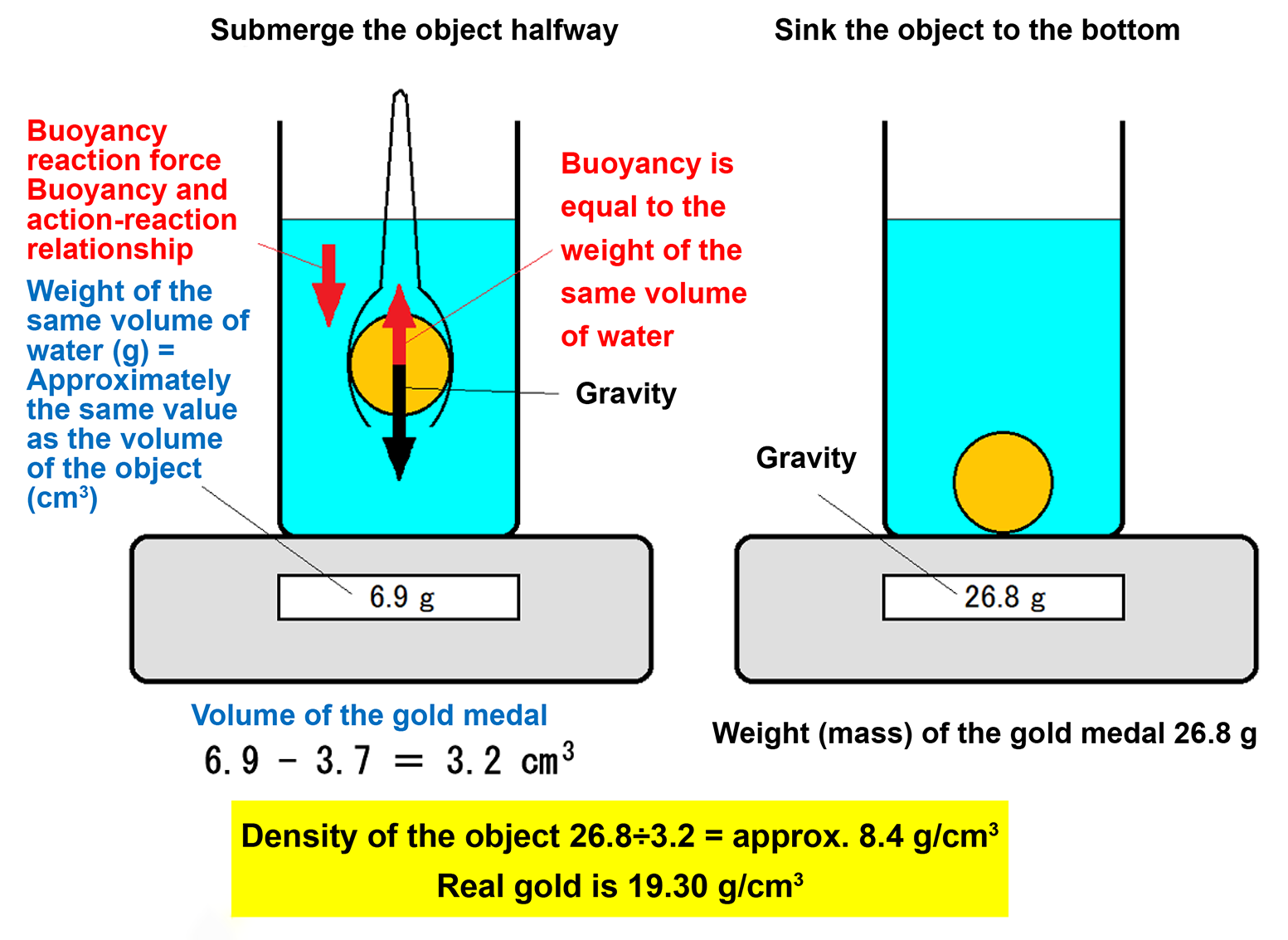 - For example, the gold medal’s volume reading is 6.9 cm3 (including 3.7 cm3 from the tongs), and its weight (mass) is 26.8 g. Calculate the medal’s density as (Density) = (mass) ÷ (volume) = 26.8 (g) ÷ (6.9 − 3.7) (cm3) = approximately 8.4 (g/cm3).