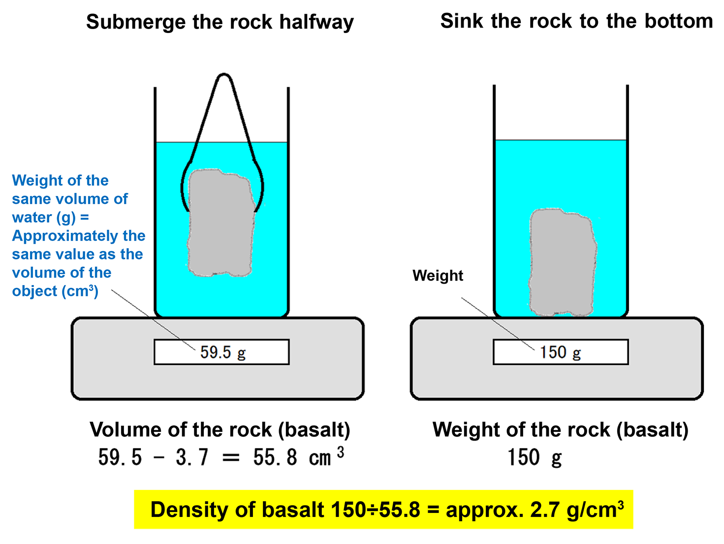 (Density) = (mass) ÷ (volume) = 184.4 (g) ÷ (74.7 − 3.7) (cm3) = approximately 2.6 (g/cm3). - The volume of the basalt is 59.5 cm3 (including 3.7 cm3 from the tongs), and its weight (mass) is 150.0 g.