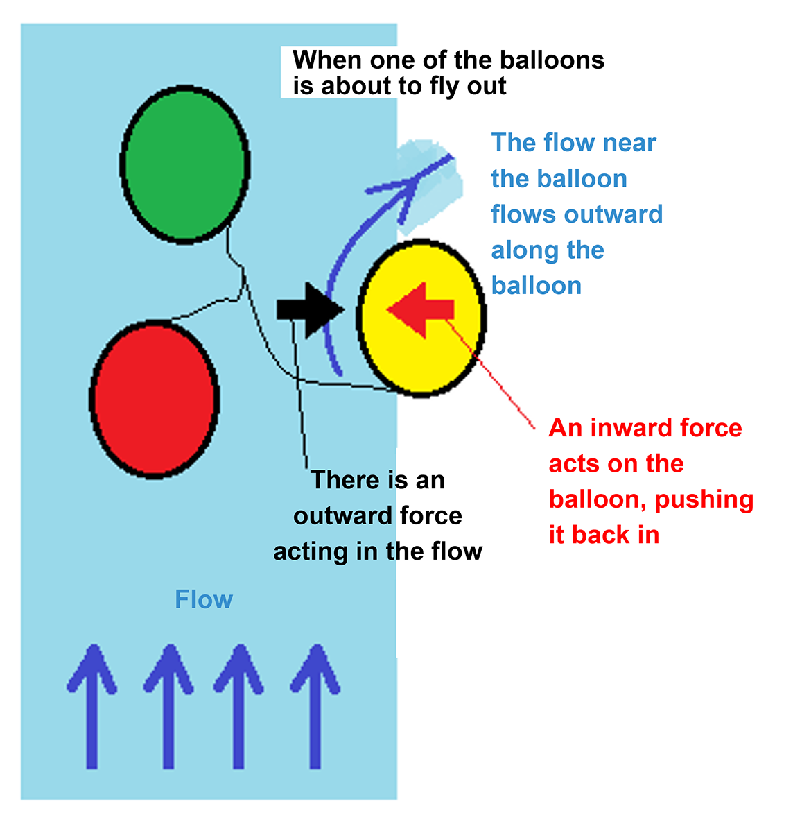 - When a balloon begins to move out of the airflow, the flow bends around it due to the Coandă effect and is directed outward. At this point, a force acts between the balloon and the airflow, attracting them to each other. The flow experiences an outward force, while the balloon experiences an inward force that pulls it back into the airflow—an example of Newton’s third law (action and reaction). In this way, each balloon remains within the flow.