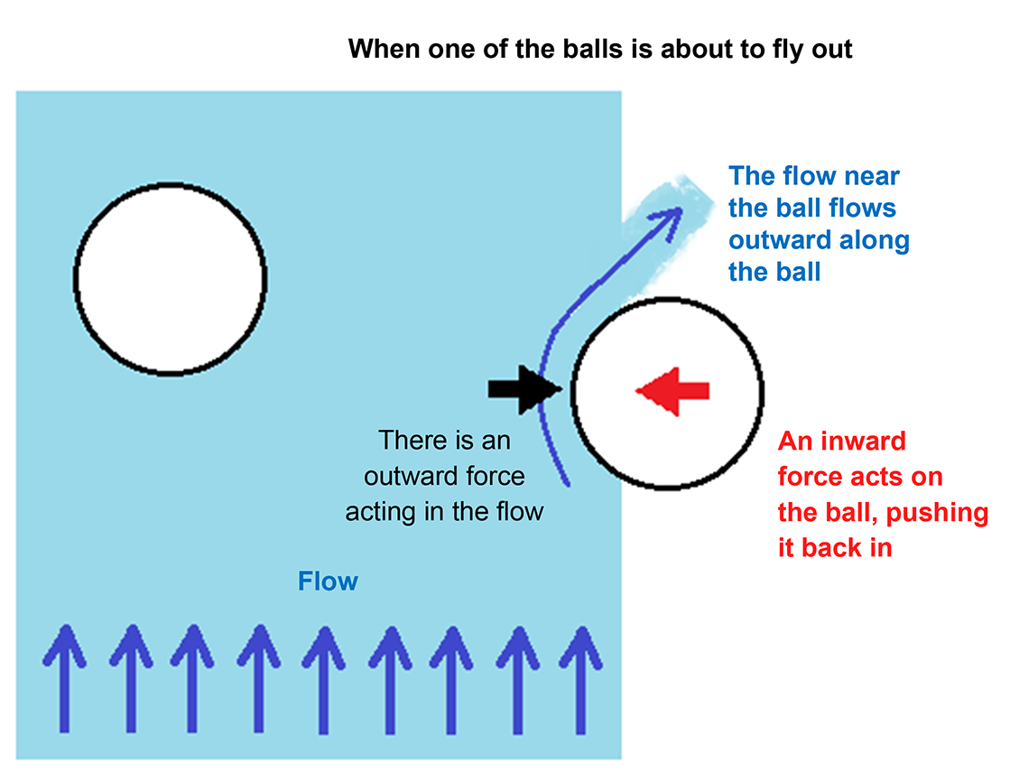 - When a ball starts to drift toward the edge of the flow, the surrounding air curves around the ball due to the Coandă effect and is deflected outward. At this moment, a force arises between the ball and the airflow, pulling them toward each other. The flow experiences an outward force, and by the law of action and reaction, an inward force acts on the ball, pulling it back into the stream. In this way, the balls remain suspended in the flow.