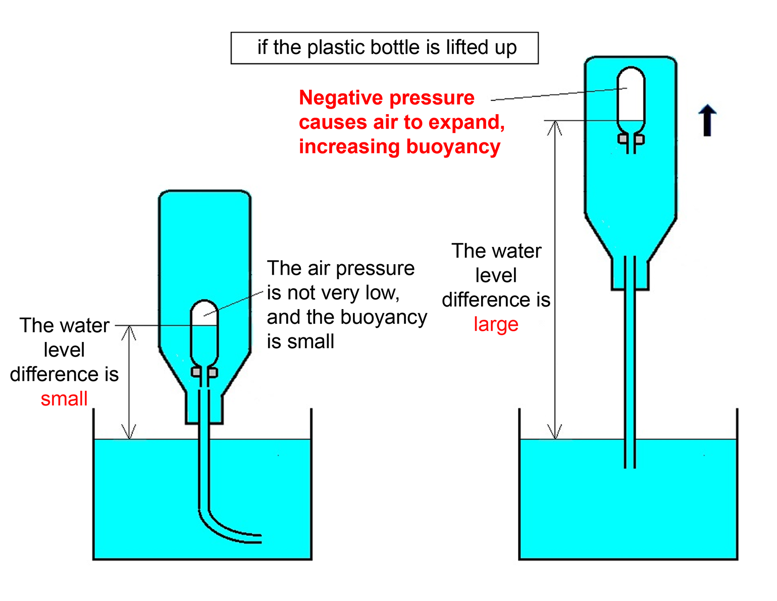 - A plastic hose is attached to the cap of the bottle, connecting it to a water tank below. When the bottle is lifted, the water level inside rises above the water level in the tank. This creates a pressure inside the bottle that is lower than atmospheric pressure—known as negative pressure. As a result, the air inside the Cartesian diver expands. This increase in volume decreases the diver’s overall density and increases the buoyant force acting on it, causing it to float upward.