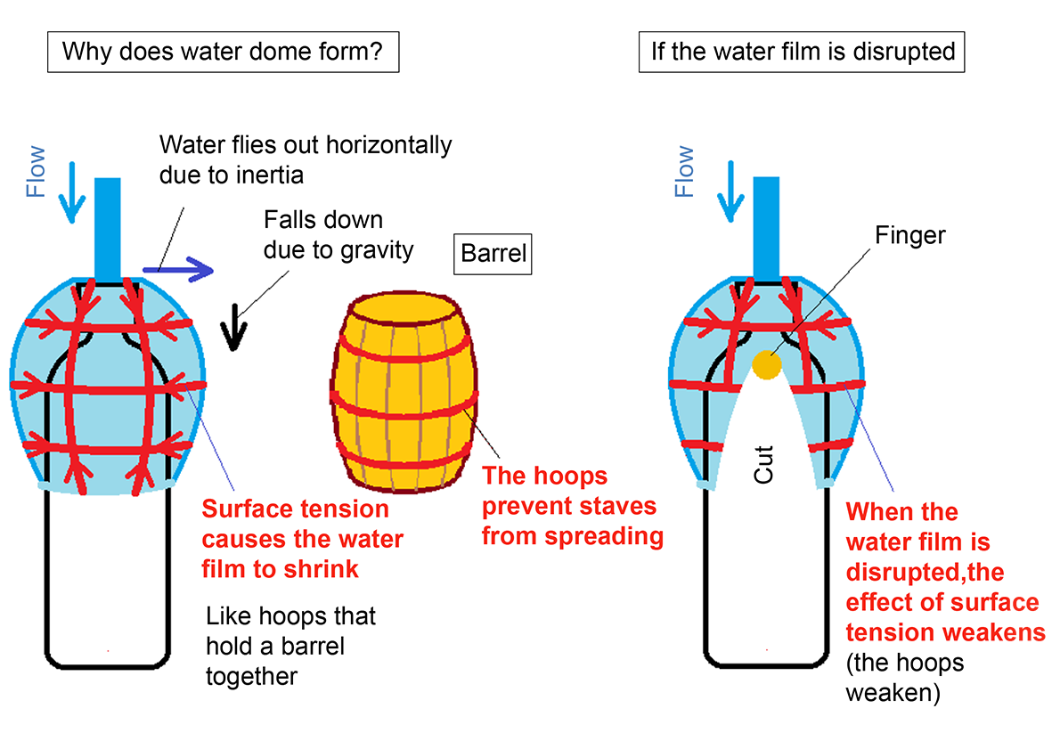 - When water first strikes the cap, inertia causes it to spread outward horizontally. Simultaneously, gravity pulls it downward. Additionally, in liquids such as water, cohesive forces between surface molecules work to minimize the surface area. This phenomenon is known as surface tension. Surface tension acts on the water film forming the dome, striving to reduce its surface area. This effect is comparable to the function of a hoop around a barrel— it resists outward expansion. As a result, the water film initially expands outward due to inertia but is then bent downward by gravity, while surface tension counters further spreading. This interplay of forces shapes the water into a dome.