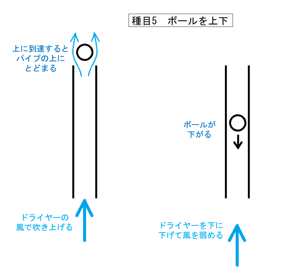 - 5番の種目です。ドライヤーの風で発泡スチロールのボール(直径6cm)をあやつり、まっすぐ立てたパイプ(アクリル、内径6.3cm、長さ50cm)の中に入れ、中に風を送り込みます。