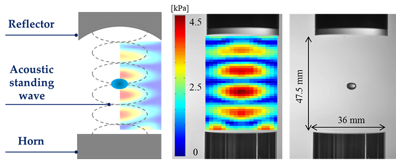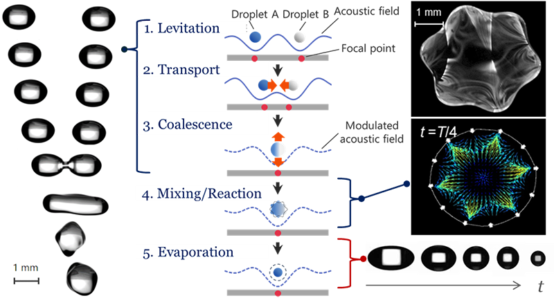 近年,界面が関与する濡れ性や蒸発に代表されるような液滴の相変化挙動に対する理解の重要性が益々高まっています.産業応用上では,冷却技術,インクジェットプリンティング,コーティングをはじめ,DNA合成,生化学アッセイ,医療診断などに代表されるように,多様な物理的,化学的,生物学的プロセスに関連付けられます[1].蒸発現象を研究する場合,固体基板上に静置させた液滴を対象とすることが一般的ですが,その見た目の単純さとは裏腹に,相変化,輸送現象,濡れの問題等が連成するために,それらの統一的理解は大きな学術的挑戦であると認識されています[2].固体との相互作用を回避し,より流体の純粋な拡散過程を観察するには,完全な自由界面を有するように液滴を浮遊させた状態にするのが理想的です.そのような液滴の浮遊実現の1つの手段として,音場浮遊法が挙げられます[3].本手法は,任意の空間に形成させた音響定在波中の節付近に,容器を用いることなく非接触サンプルを保持・操作可能とする利点があります(図1).浮遊させた液滴に対しては,輸送,合体,混合,反応,蒸発等の操作が可能であることも本手法の魅力を向上させています(図2).しかしながら,Lab-in-a-dropと表現できるような精緻かつ自在な操作の実現のために,非線形音響場と浮遊液滴の応答としての界面動力学,非定常な流動場,温度場,濃度場,さらには非平衡過程である相変化等が連成する物理現象を詳らかにする必要があります.