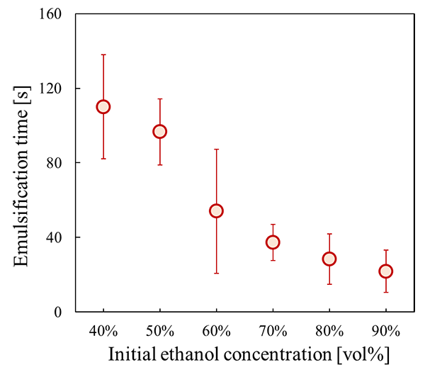 図3 ウーゾ液滴の蒸発誘起相分離現象:(左)相分離過程の動画,(右)乳化時間