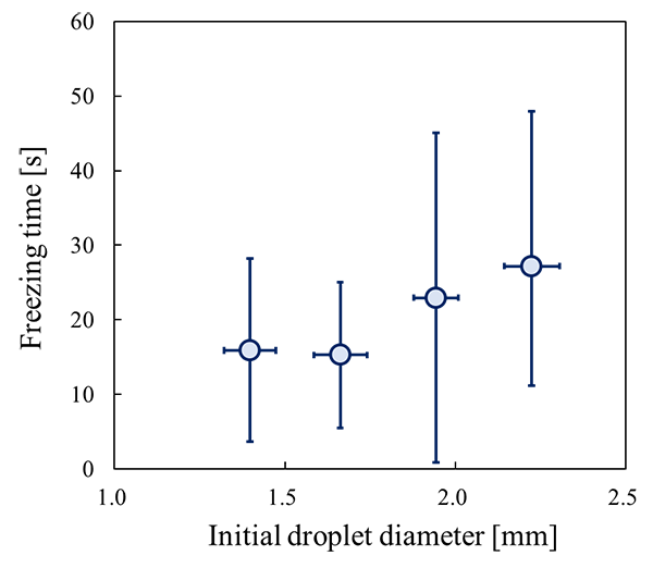 図4 シクロヘキサン液滴の蒸発誘起凍結現象:(左)凍結過程の動画,(右)凍結開始時間