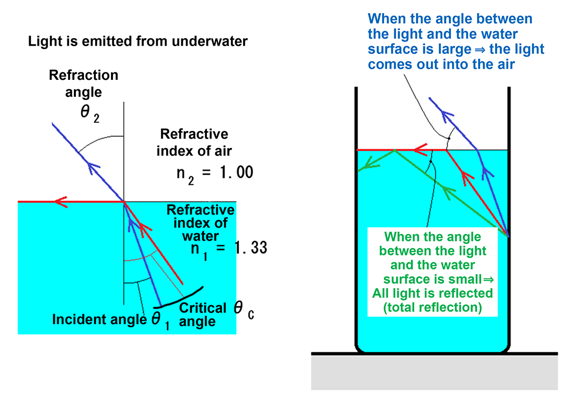 - The angle of incidence at which light transitions between being refracted into the air and being totally reflected within the water is called the critical angle θc. For the water–air boundary, the critical angle