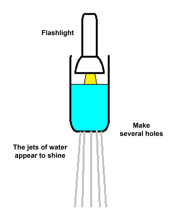 - Fill the container with water and observe the flow. Shine a flashlight into the container, and you’ll see the light traveling along the water stream.