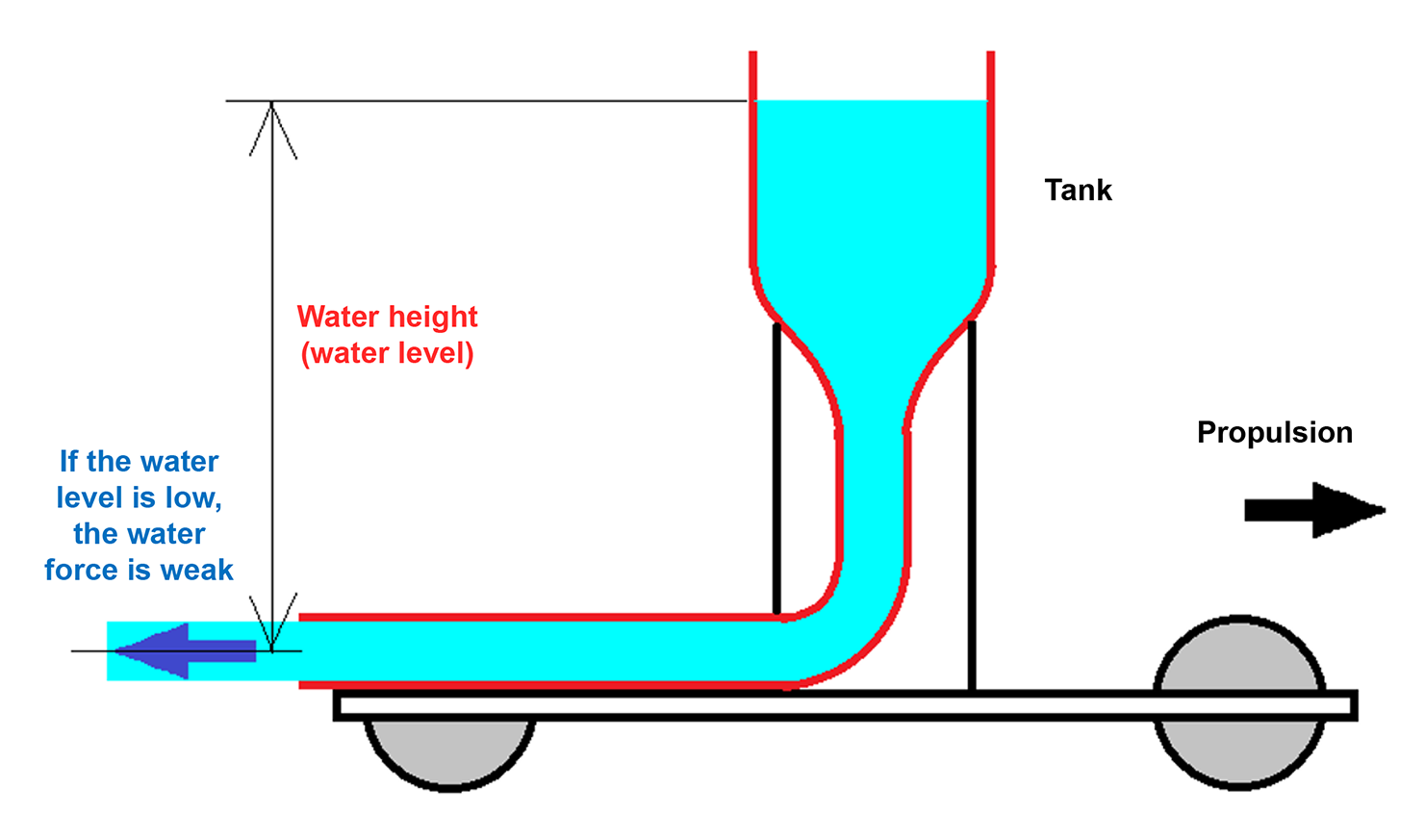 - This means the water’s potential energy (height energy) is reduced, resulting in weaker propulsion and diminished car performance.