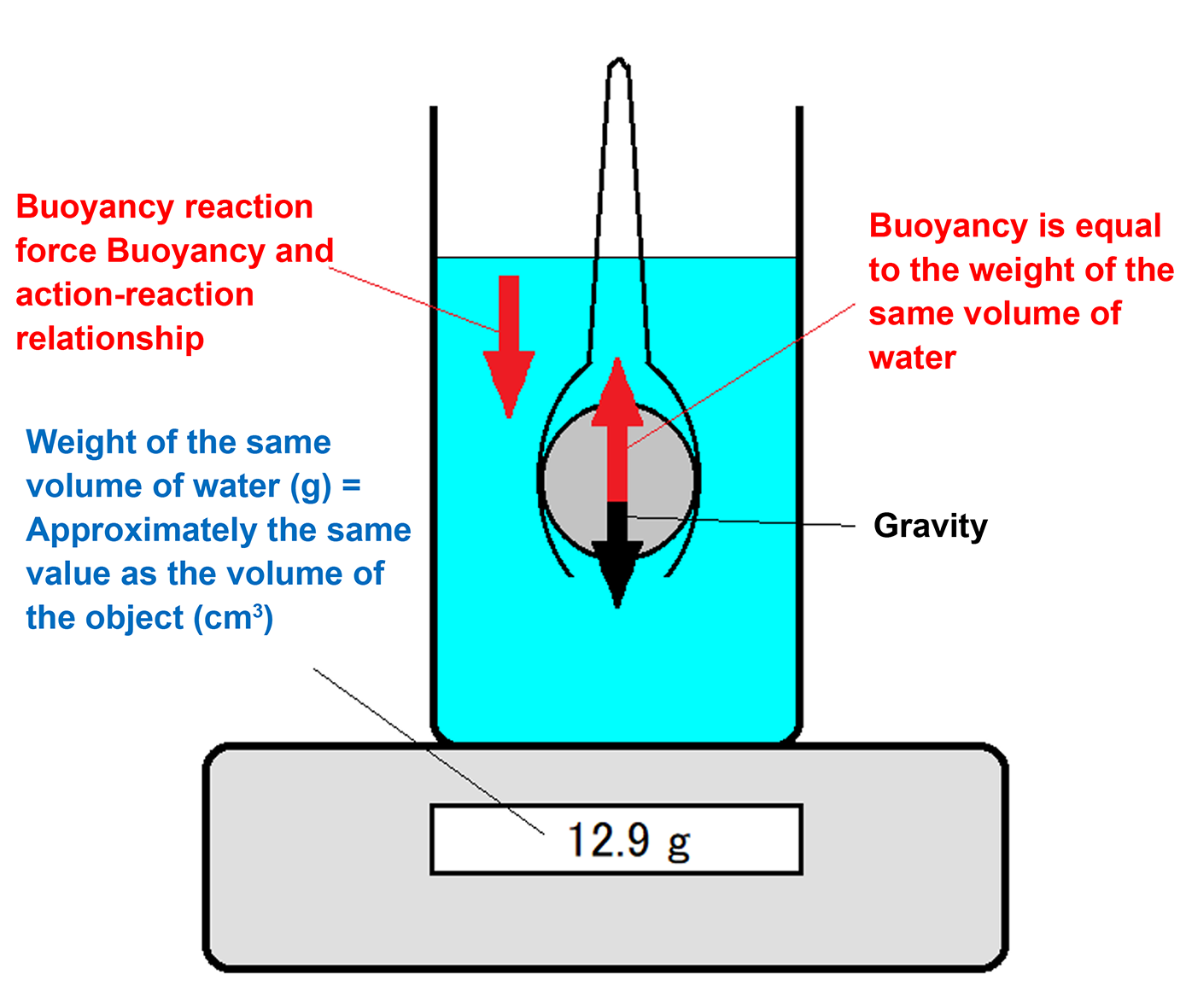 - Use Archimedes’ principle to measure the volume as (displayed weight [g]) = (volume of water [cm3]) = (volume of object [cm3]).