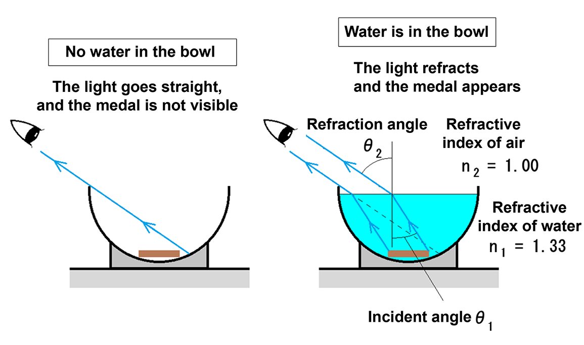- When light passes from water into air, the angle of refraction becomes larger than the angle of incidence. This bending of light makes the medal visible.