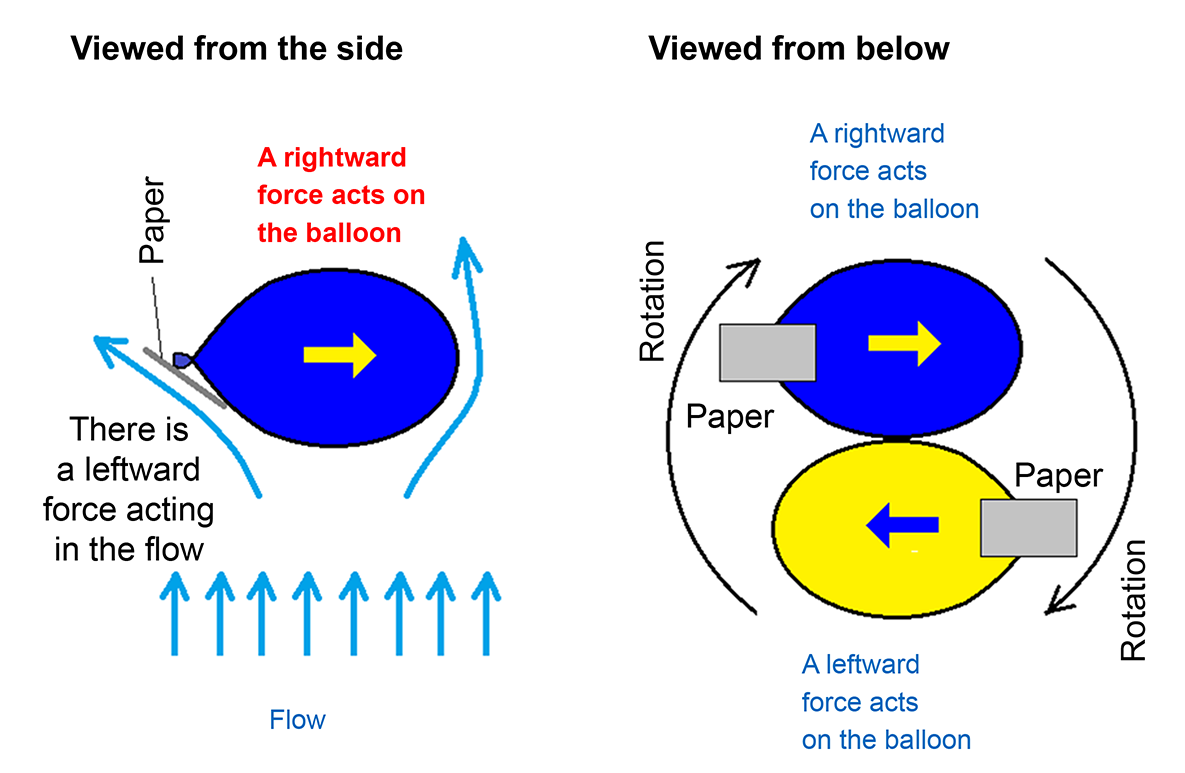- When a balloon begins to move out of the airflow, the flow bends around it due to the Coandă effect and is directed outward. At this point, a force acts between the balloon and the airflow, attracting them to each other. The flow experiences an outward force, while the balloon experiences an inward force that pulls it back into the airflow—an example of Newton’s third law (action and reaction). In this way, each balloon remains within the flow.