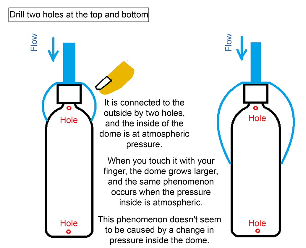 - To test this hypothesis, I drilled two small holes—one at the top and one at the bottom of the plastic bottle—to ensure that the inside of the water dome remained at atmospheric pressure by connecting it to the surrounding air. Under these conditions, there should be no pressure difference between the inside and outside of the dome. Let’s experiment under this condition.
