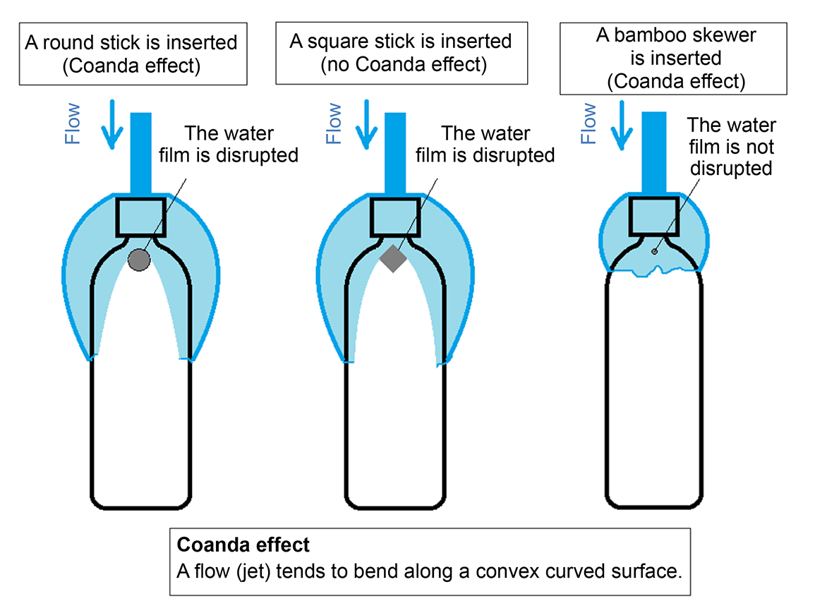 - When a thin, round stick—such as a bamboo skewer—is inserted into the water film, the Coandă effect causes the water to flow around to the back of the stick. As a result, the water film does not break, and there is little change in the size of the water dome. In other words, the Coandă effect no longer contributes to an increase in dome size and can, in this context, actually suppress its growth.