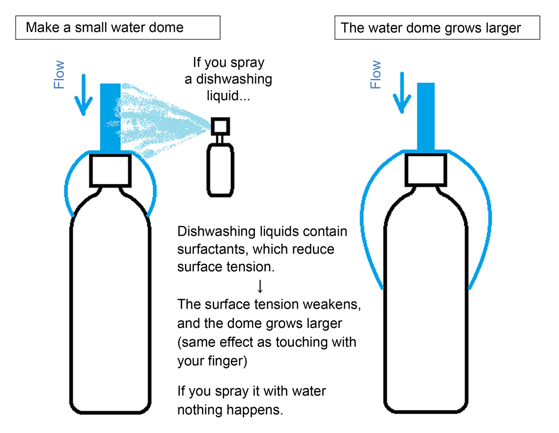 - We learned that the water dome grows larger when touched because the water film is disrupted, weakening the effect of surface tension. If this is true, the same phenomenon should occur when surface tension is weakened by another method.