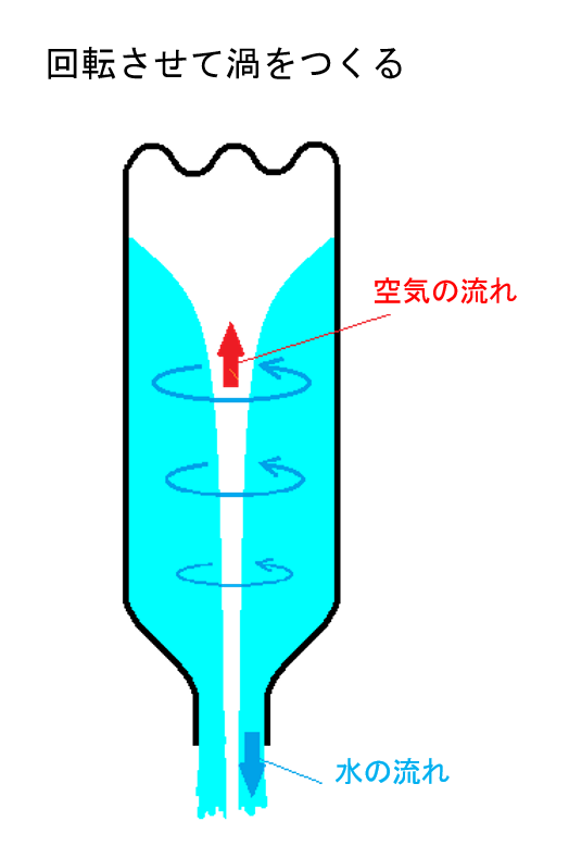 - ペットボトルを回転させて中に渦をつくります(このときの渦は自由渦というものです)。