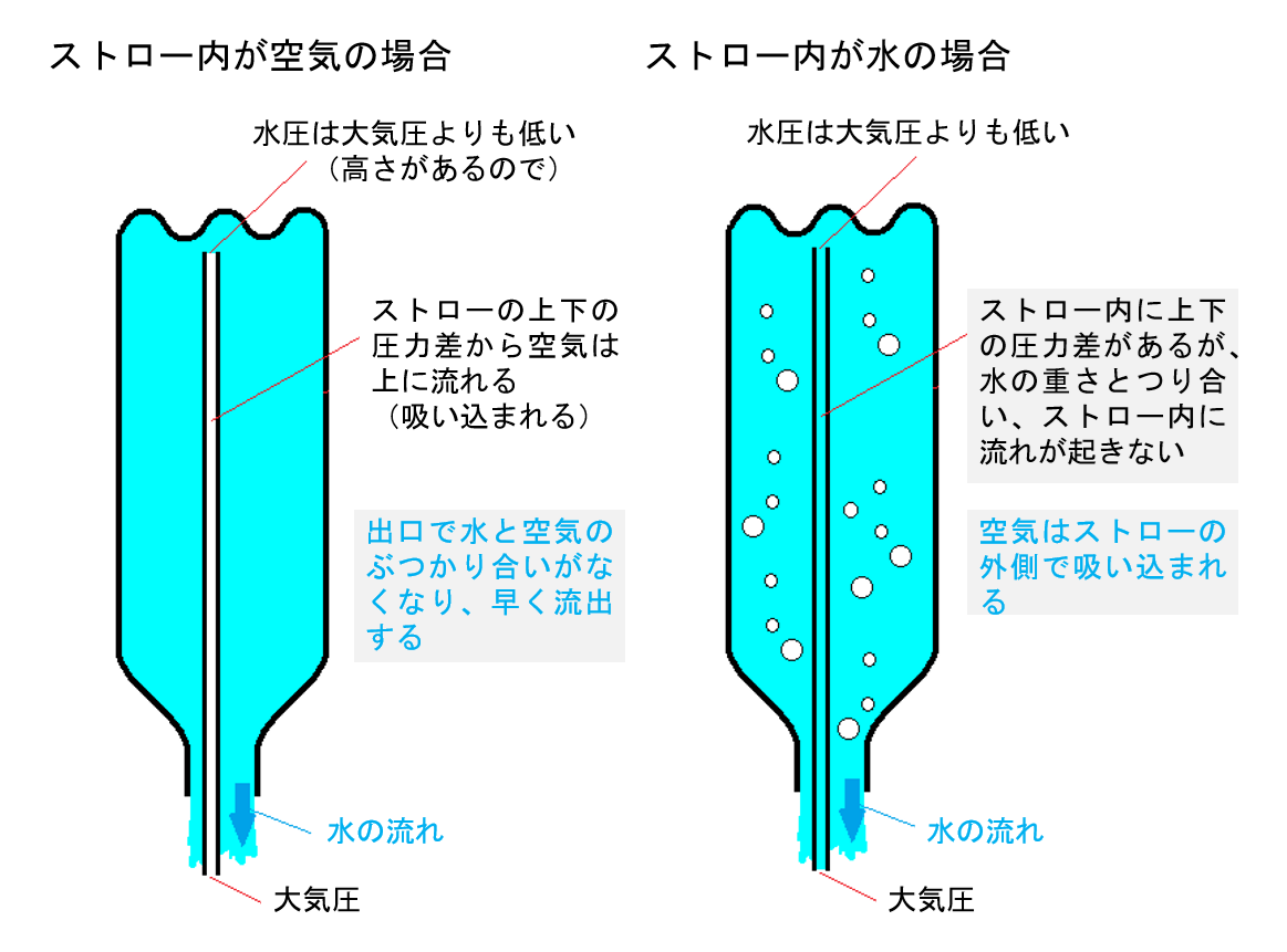 - ストローの下端は大気圧、上端の水圧は大気圧より低くなっています(上下の高さの分だけ浅い上部は水圧が下がる)。前半の実験では、ストロー内は空気なのでこの圧力差によって空気は上向きに流れます。つまり、吸い込まれます。しかし、後半の実験ではストロー内の水の重さがあり、これを吸い上げることができず、空気の通り道が確保できなくなったのです。空気はストローのまわりから吸い込まれて泡がたくさんできます。空気の通り道としてストローが機能していないのです。