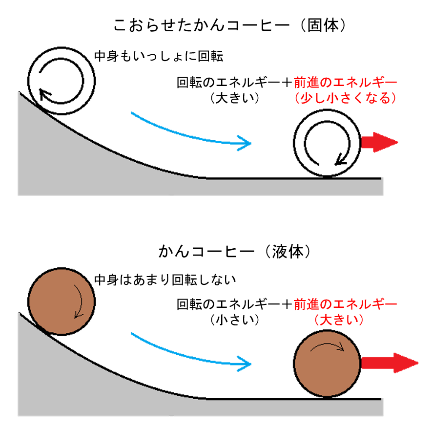 - 常温のかんコーヒーでは、液体なので変形することができ、外側が回転しても中の液体はあまり回転しないでいられます(慣性という性質によって運動しにくくされている)。回転のエネルギーは小さくなり、その分のエネルギーを前進のエネルギーで使えるのです。そのため、速くころがることができるのです。