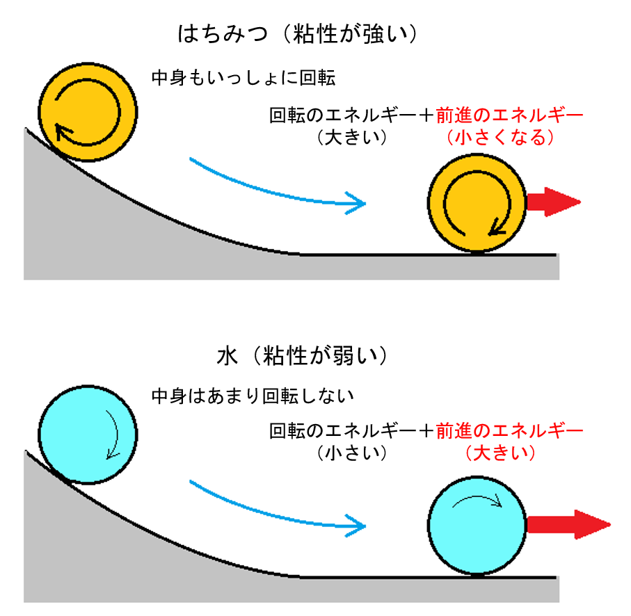 - 水のほうは変形しやすく、外側が回転しても中はあまり回転しないままでいられます。中身の回転はおさえられ、はちみつにくらべて回転のエネルギーが小さくなります。その分だけ、前進のエネルギーとして使われ、速くころがることができるのです。