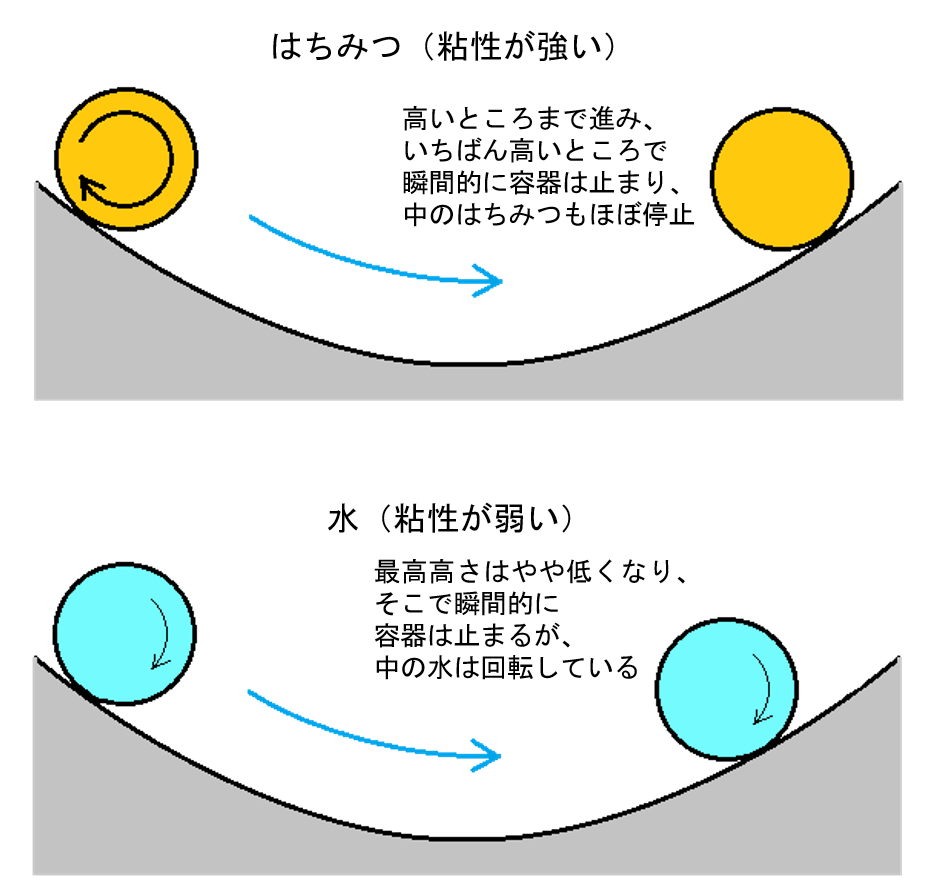 - 粘性の強いはちみつは、高いところまでのぼり、エネルギーの損失が小さいことがわかります。そのため、少しずつ高さは下がっていきますが、何往復も運動を続けます。