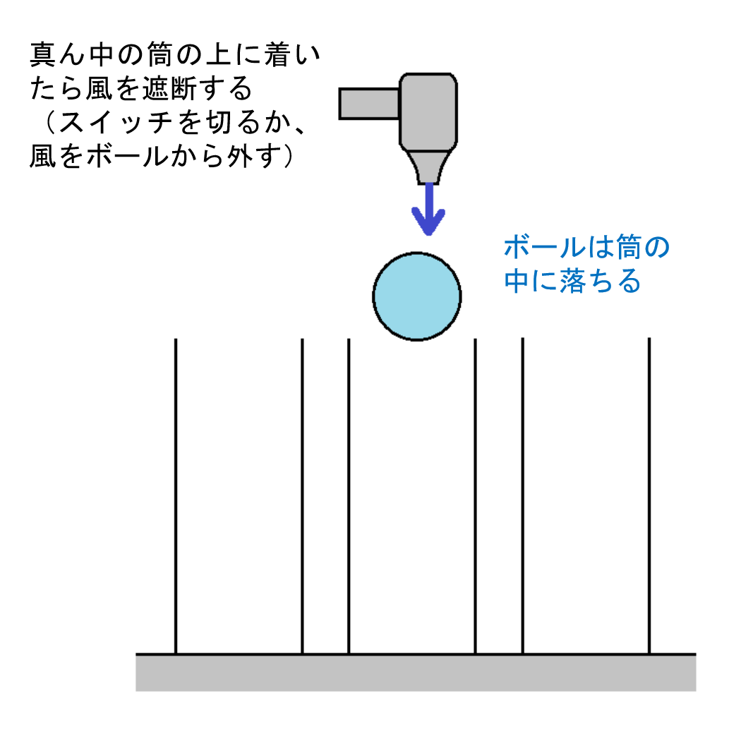 - ドライヤーを移動して真ん中の筒の上に来たところで、ボールに当たる風を遮断します。スイッチを切るか、ドライヤーの風をボールからはずせばよいのです。すると、ボールは筒の中に落ちます。