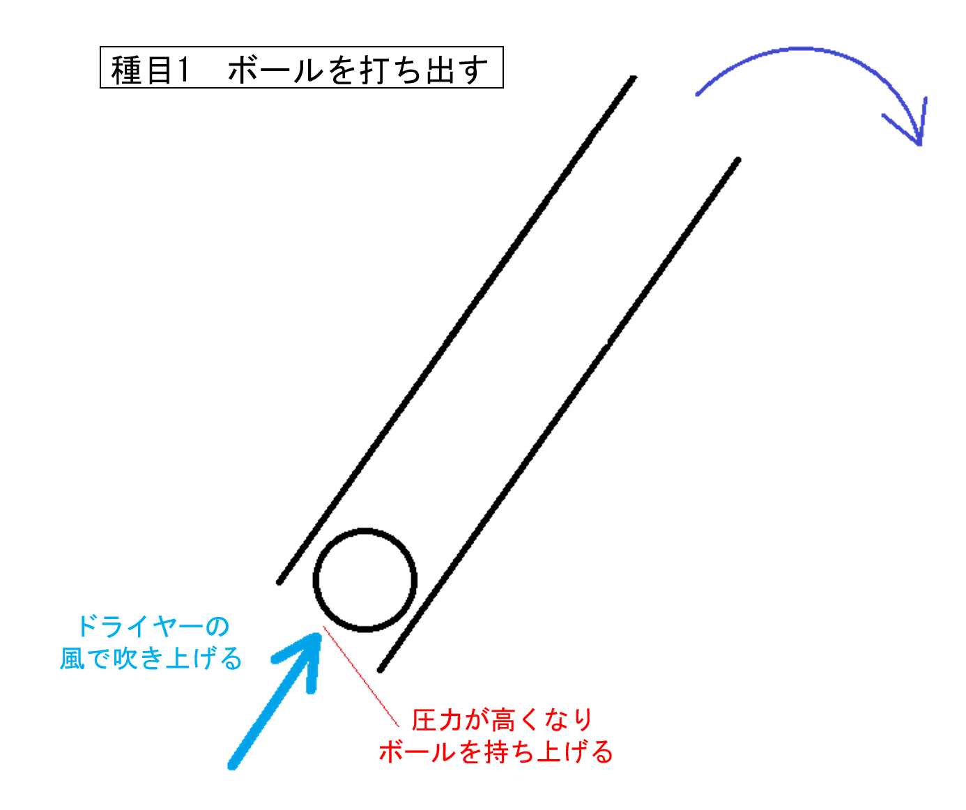 - まず1番の種目です。ボールをドライヤーで上げて、ななめに固定されたパイプ(アクリル、内径6.3cm、長さ50cm)の下側から入れて上から出すというものです。