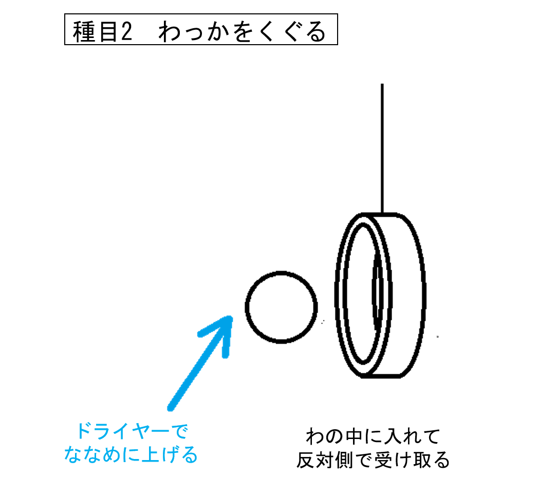 - 2番の種目です。つるされたテープのわっか(外径11cm、内径7.6cm、幅3cm)(なお工学では、外径、内径はそれぞれ半径ではなく直径のほうを表します)に、発泡スチロールのボール(直径6cm)をくぐらせます。