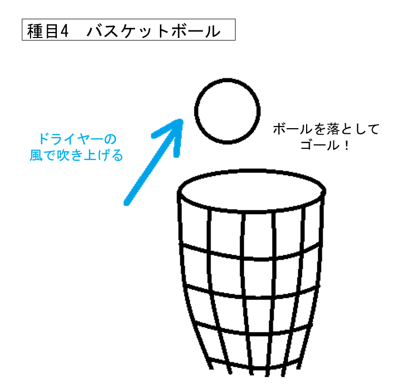 - 4番の種目です。ドライヤーの風で発泡スチロールのボール(直径6cm)をあやつり、バスケットボールのゴールに落としてクリアです。