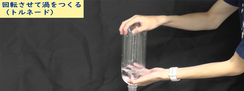 ペットボトルを回転させて、中に渦をつくって流出させてみましょう。 |