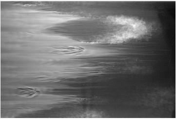 図5 はさらに主流乱れが小さい場合の連続写真である.乱流格子は前述のノズル上流においたもので,上流への噴流は止めている.主流流速はU∞ = 12 m/s,乱れ強さはTu = 0.19% である.局所T-S 波の崩壊過程も観察されたが,連続写真のようにストリーク構造に細かい波状の二次不安定が現れ崩壊していく過程も観察された.さらに,図6 に示すように,高速領域と思われる黒く写っているストリークの両側に発生する二次不安定による崩壊も観察された.T-S 波のような modal な撹乱は指数関数的に成長するため,代数的な成長をするnon-modal な撹乱に比べ初期撹乱が小さい場合には有利であると考えられている.Tu=0.19% の結果はこのことと矛盾している.また図5 と図6 のどちらのストリークも乱れ強さが大きい場合のストリークに比べ流れ方向の長さが比較的短い.これは,この短いストリークの崩壊過程が3 番目の過程として分類できる可能性を示唆している.