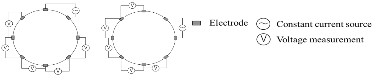 電気トモグラフィー(Electrical Impedance Tomography:ET)法[1]は、測定対象の周囲に複数の電極を配置し、電極対間で定電流印加および電圧計測を行うことで、計測された電圧変化∆Uに基づき、逆問題解析により測定断面内の導電率変化∆σを画像として取得する可視化計測手法である。計測電圧Uおよび導電率分布σはそれぞれ列ベクトルとして定義し、基準状態に対する電圧変化および導電率変化を用いて解析を行う。図1にET法の基本フローを示す。まず、測定系のジオメトリおよび電極配置に基づき、順問題解析から感度行列Jを算出する。電位分布は準定常電解方程式を有限要素法により数値解析することで求められ、この解析は複数の電極パターンについて繰り返し実施される(図2)。電極パターンとしては、隣接法をはじめ[2]、準隣接法[3]二電極法[4]が用いられている。得られた感度行列JはM×Nの行列となり、電圧測定値から導電率分布を推定する問題は一般に不適切逆問題となるため、正則化項を導入した最小化問題を解くことで導電率変化∆σを求める。