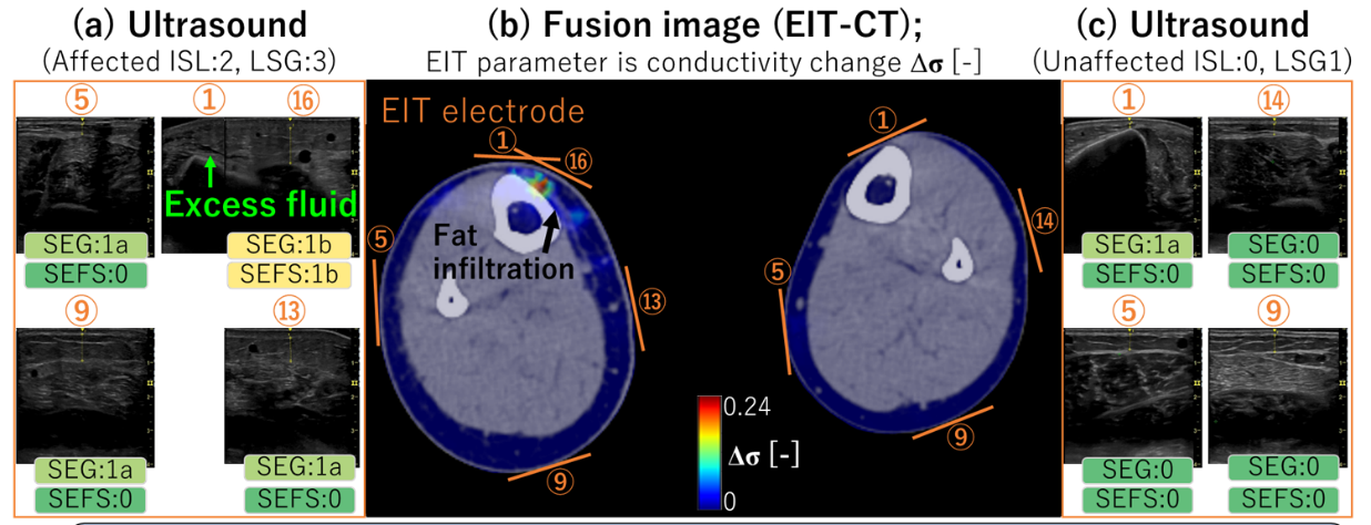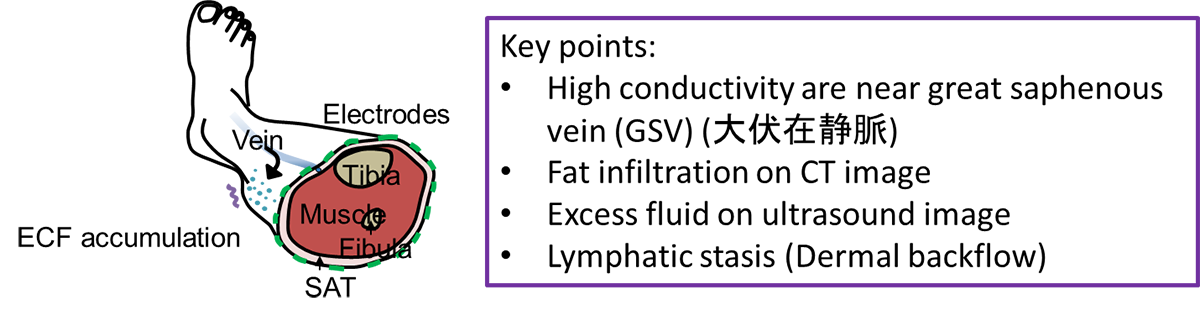大伏在静脈(GSV)付近では伝導率が高い、CT画像では脂肪浸潤がみられる、