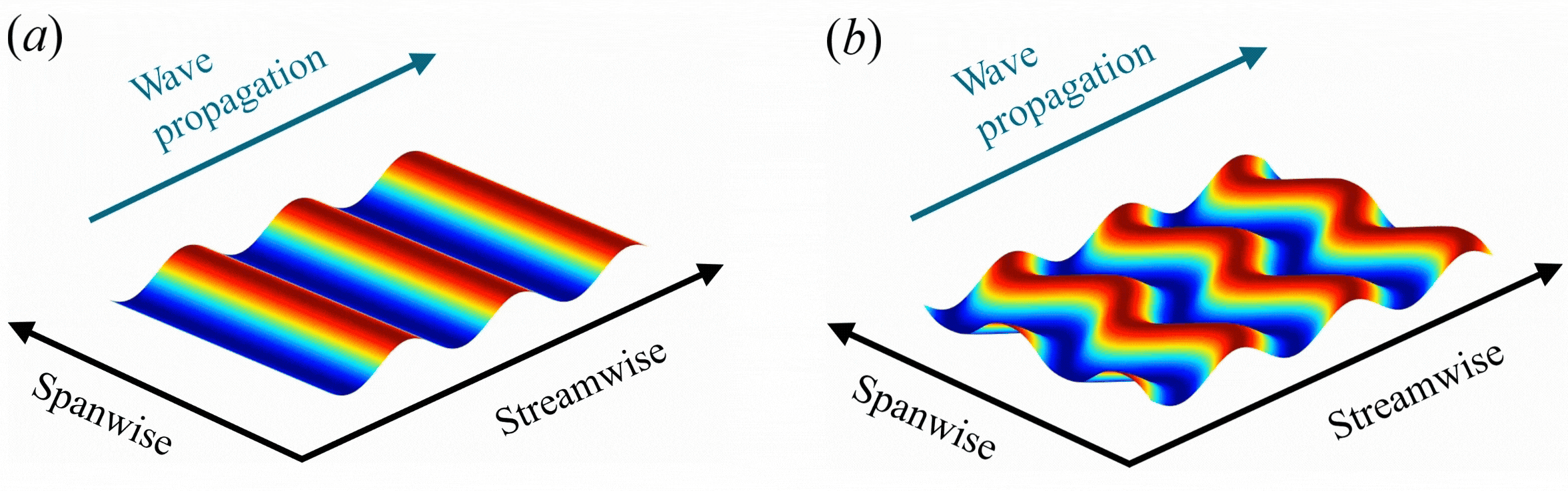 Fig.1 Schematic of streamwise traveling wave-like wall deformation: (a) spanwise-uniform[1] ; (b) with spanwise phase shift.