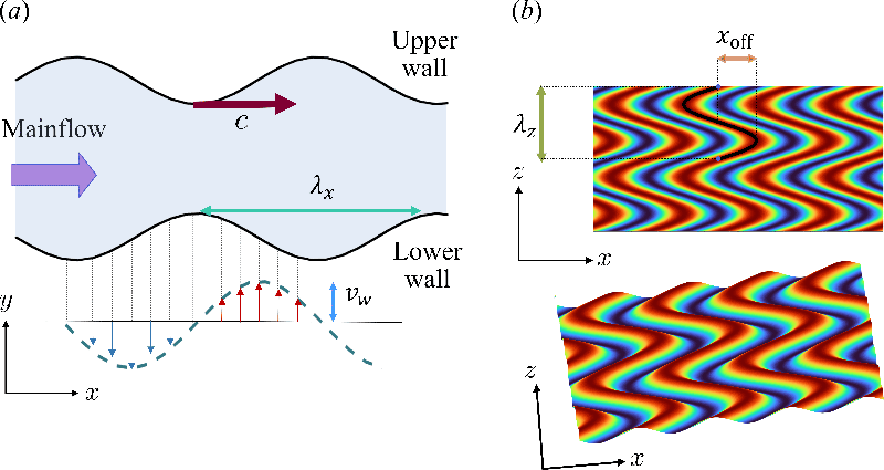 は主流方向進行波の波長であり,従来型の主流方向進行波状壁面変形と共通の制御パラメータである.一方,Fig. 2(b)に示すように,