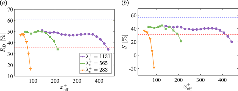 . Blue and red dotted lines represent the optimized case in Nabae & Fukagata[1] and the maximum drag reduction case in Nabae et al.[3] , respectively.