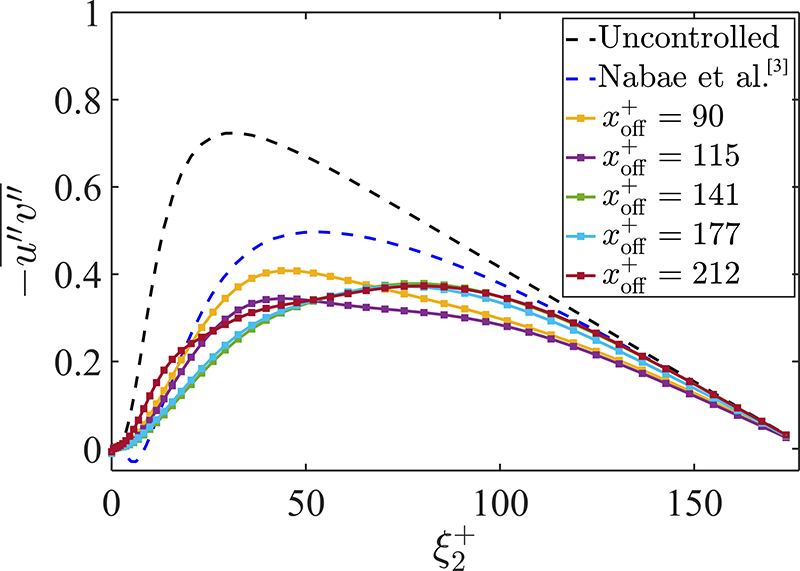 本手法において高い抵抗低減効果が得られた要因を解明するために,レイノルズせん断応力 (RSS) の乱流成分 (以降,乱流 RSS) に着目する.Figure 4に示す における乱流RSSを見ると,非制御およびNabae et al. [3]と比較して,本手法では壁面近傍における抑制が顕著であることが分かる.これが,本手法において先行研究よりも高い抵抗低減効果が得られた主因であると考えられる.