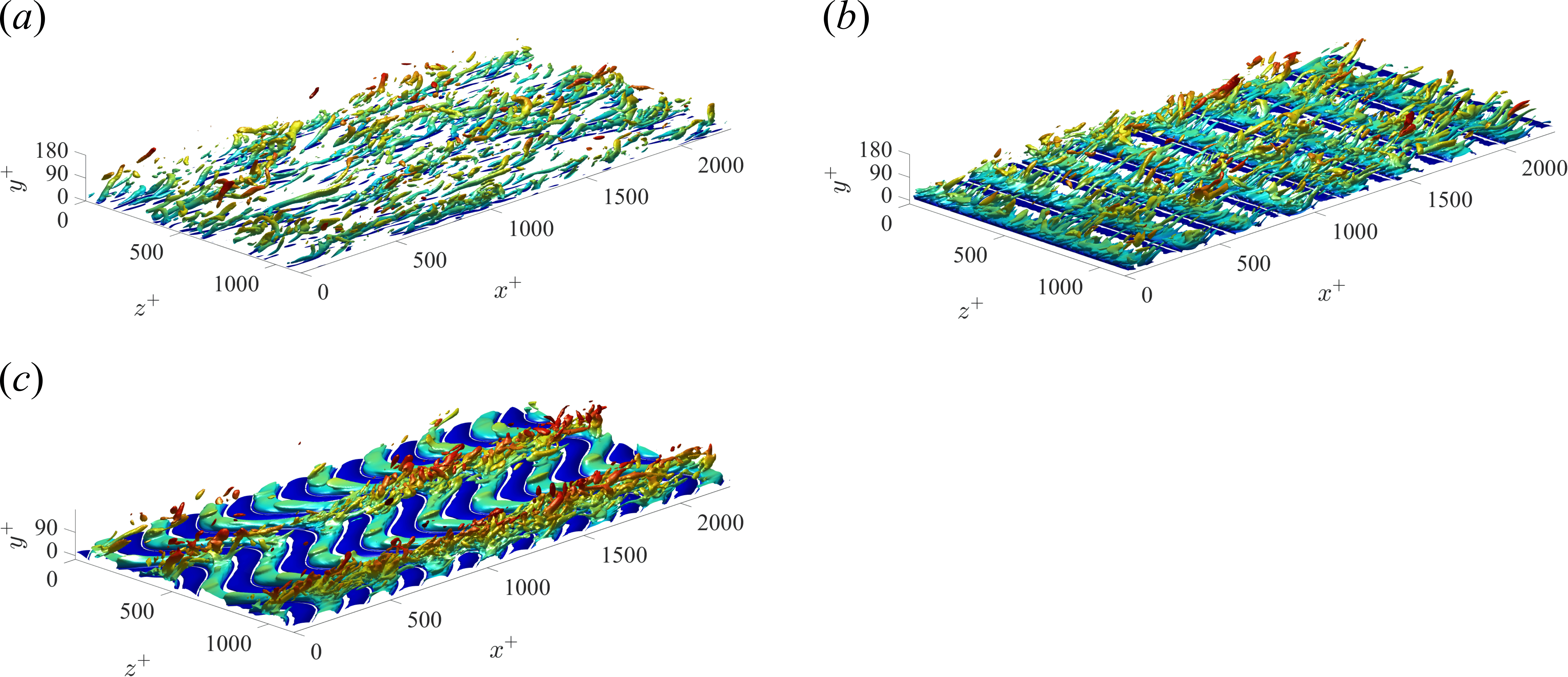 Fig. 5 Instantaneous vortical structures identified using the Q criterion[4] : (a) the uncontrolled case; (b) the maximum drag reduction case in Nabae et al.[3] ; (c) the maximum net energy saving case (). Color represents the wall-normal coordinate in the real space.