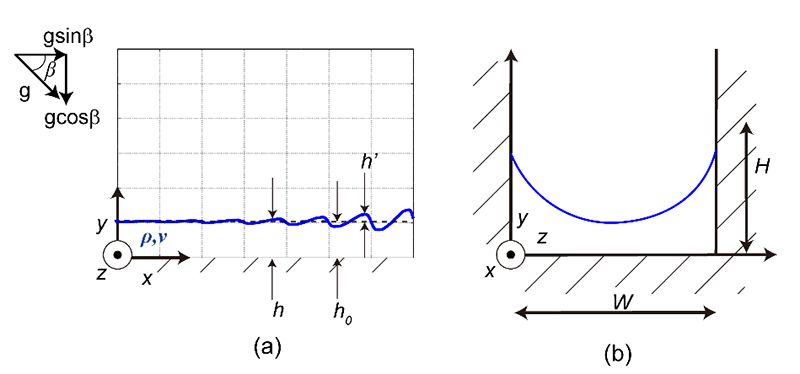 Fig. 1 Falling liquid film on an inclined plane: (a) side view (b) cross-sectional view.
