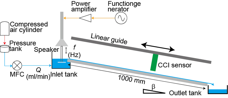 実験装置の概要図をFig. 2に示す.マスフローコントローラで供給された液体は流入直前でスピーカによる擾乱を与えられた.チャネル内を流下する液膜流の膜厚は共焦点センサを用いて計測した.共焦点センサは二台のリニアガイドに搭載され,流れ方向,幅方向に高精度の移動を可能とした.