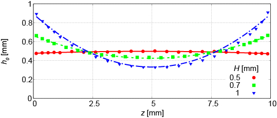 Fig. 3に幅方向の界面形状に関する実験結果を示す.いずれの側壁高さでも液膜は側壁角部で固定されている.液体流量は mmのチャネルで平らな液膜が得られるように選択したが,実際この条件で液膜に曲率がないことを確認できる.