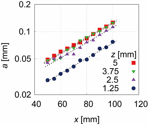 側壁高さによる擾乱の成長・減衰を定量化するために空間成長率を算出する.Fig. 5は表面波の振幅をログスケールでプロットしたものである.