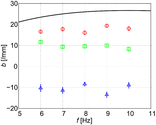 Fig. 6は,横軸に擾乱周波数,縦軸に空間成長率を示したものである.黒い実線は,幅方向の影響を考慮しない二次元の線形安定性解析 (7)の結果である.実験結果はいずれの側壁高さにおいてもこの理論曲線より小さな空間成長率を示しており,側壁の存在が擾乱の発達を抑制していることが分かる.さらに,側壁高さが増加するにつれて空間成長率は低下している.これらの結果は,Fig. 3で示した濡れ上がりの増大と整合しており,側壁近傍で形成される濡れ上がり形状が流れを安定化させる効果を有することを明確に示している.
